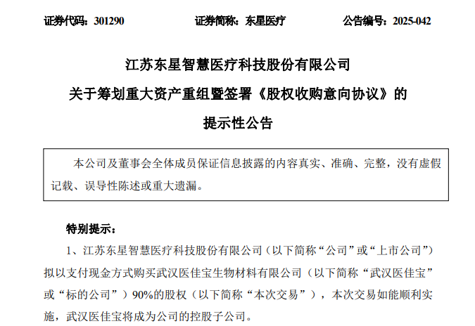 目前,此次交易尚处于初步筹划阶段。2025年9月26日,东星医疗已经与武汉医佳宝全体股东签订了《股权收购意向协议》,但最终收购股权比例、交易对方及交易价格尚需交易各方进一步协商后确定。