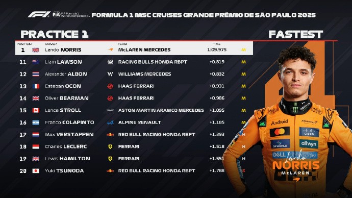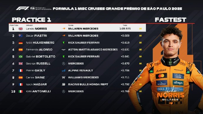 北京时间11月7日,F1巴西大奖赛唯一一次练习赛结束。诺里斯在最后时刻超越皮亚斯特里拿到P1,皮亚斯特里、霍肯伯格位居二三信富网,阿隆索第四,博托莱托第五,拉塞尔第六,维斯塔潘、勒克莱尔、汉密尔顿分列17-19位。